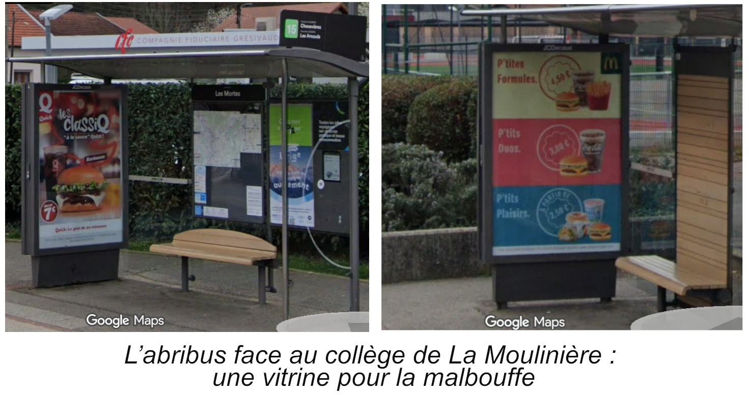 À Domène, en Isère, à quelques mètres seulement du collège de La Moulinière, des élèves attendent chaque jour leur bus sous des publicités pour de l’alcool, pour McDonald’s, pour Quick. Des images lumineuses, séduisantes, soigneusement conçues pour capter l’attention. Des slogans qui associent ces produits au plaisir, à la détente, à la convivialité.